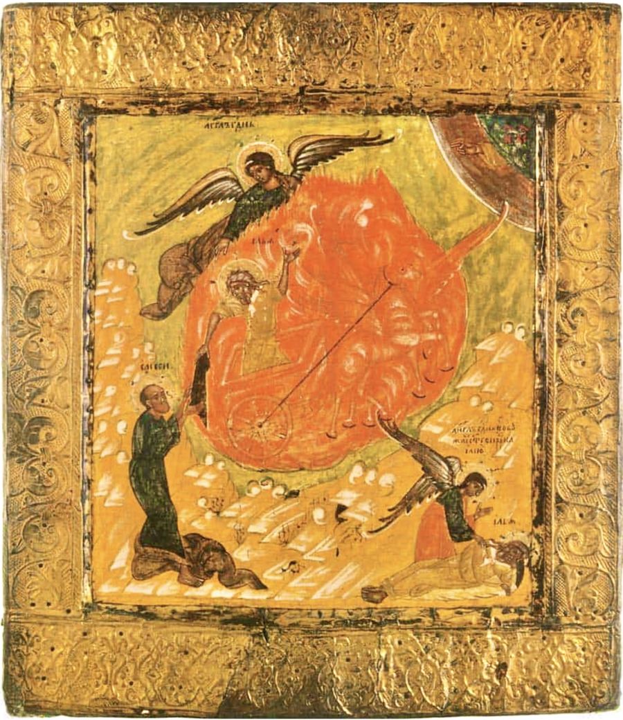 He was filled with the ardent love of the seraphim, until, having become similar to the angelic hierarchies, he was taken up to heaven by a chariot of fire.