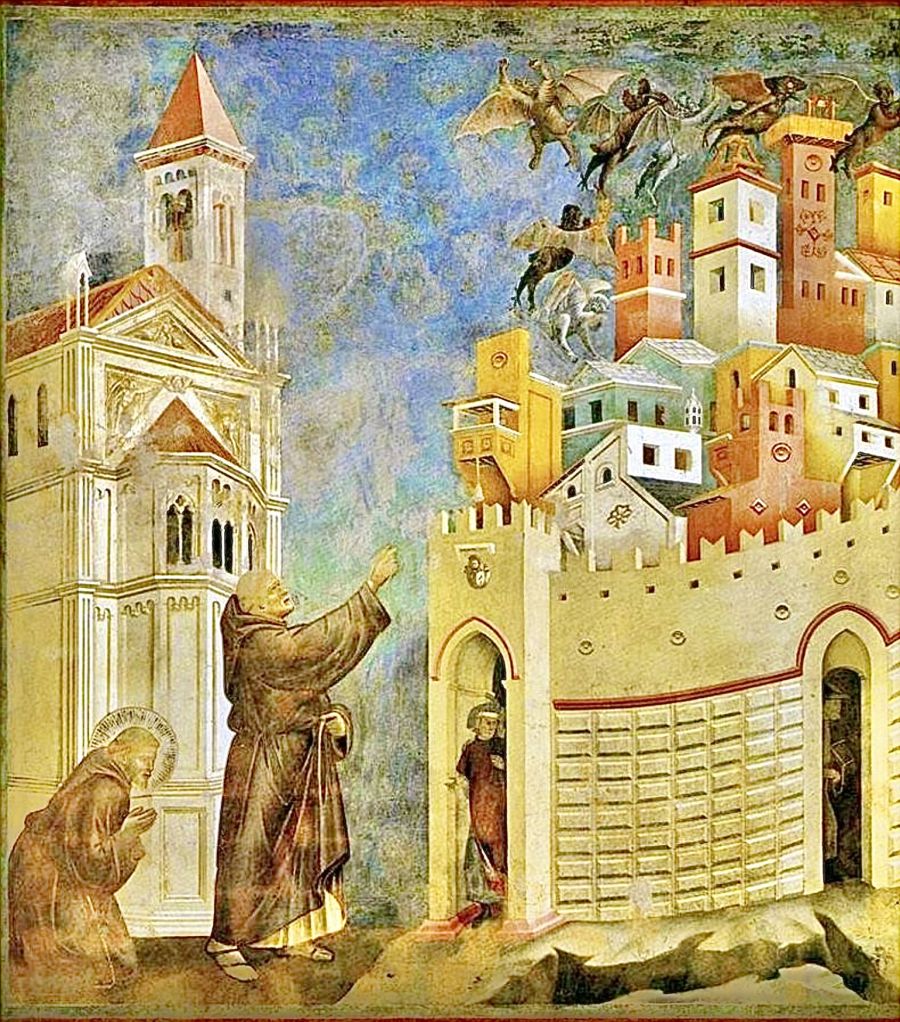 "He arrived one day in Arezzo, while the whole city was shaken by civil war and threatened with imminent ruin. The servant of God was lodged in the village outside the city, and saw over it exultant demons, who were stirring up the citizens to destroy each other. He called Brother Sylvester, a man of God and remarkable simplicity, and commanded him: