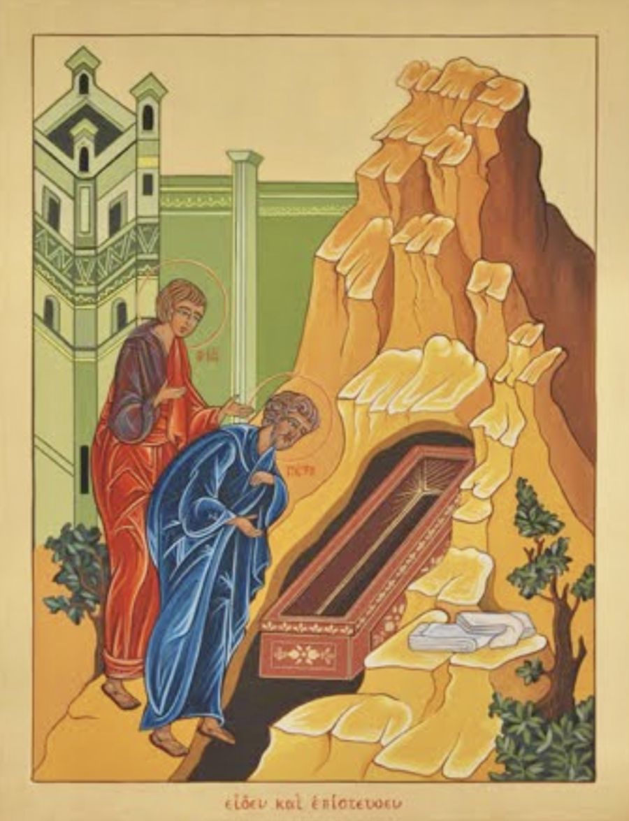 «Ora, correvano i due insieme, e l’altro discepolo corse avanti più presto di Pietro e venne per primo al sepolcro, e chinatosi vede i panni di lino ravvolti a parte; tuttavia non entrò» (Gv 20,4-5)
