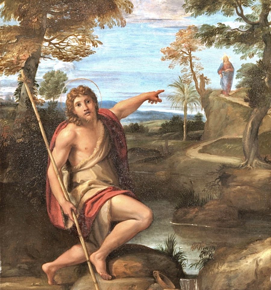 Il Battista volge l’indice su Gesù-Agnello che toglie il peccato del mondo.