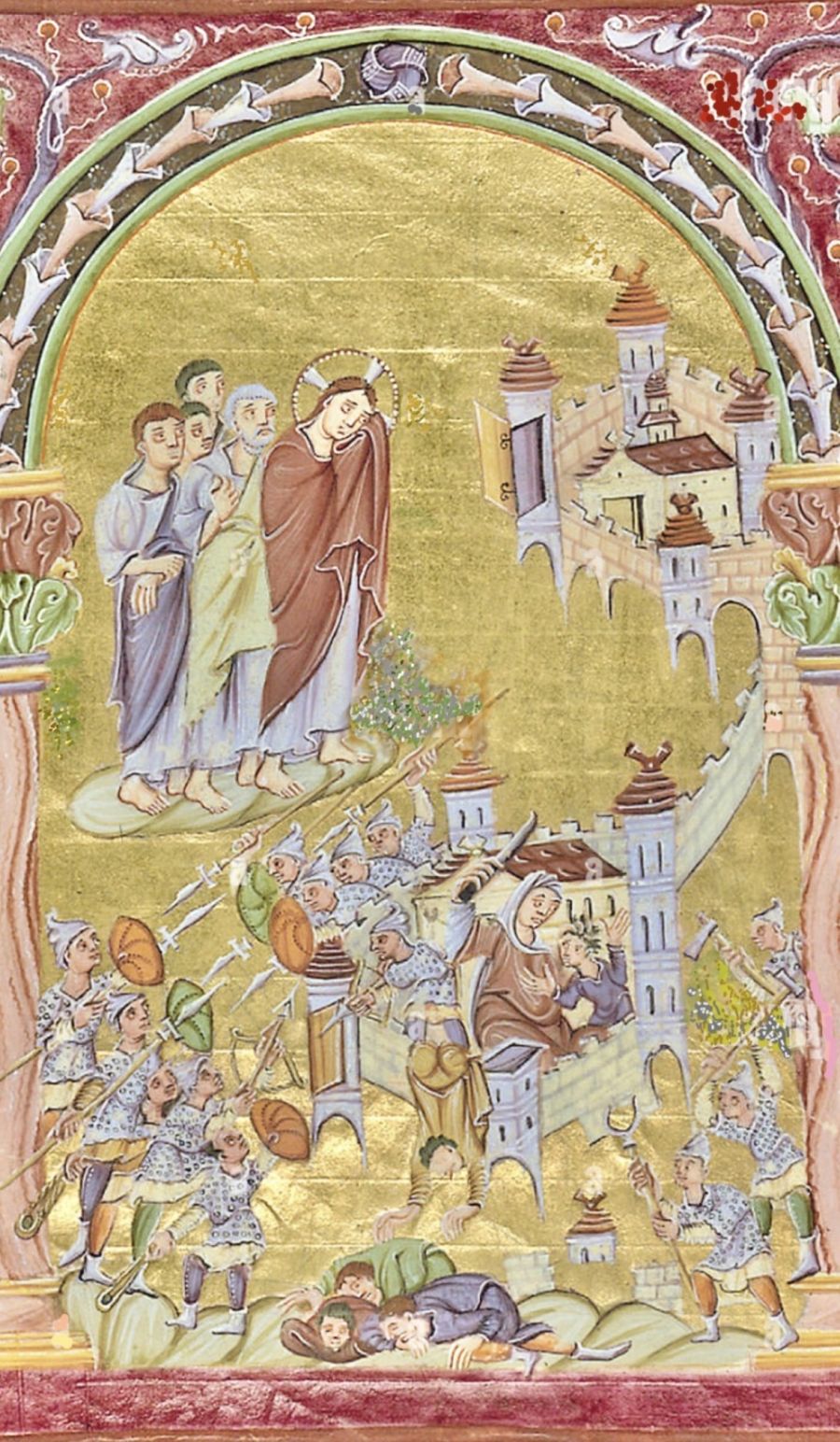 Un tempo, ecco trincee, uccisioni e distruzione delle mura e delle case da parte di Nabucodonosor; poi quella romana del 70 cui allude più direttamente il testo.