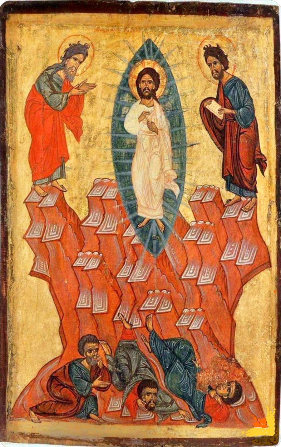 Come nelle icone orientali, si ritrovano faccia a terra [Mt 17,6; nella cultura dell’oriente antico significava precisamente: “sconfitti” nelle loro aspirazioni] e spaventati. Timorosi di essere chiamati anche loro al dono di sé: Mc 9,6; Mt 17,6; Lc 9,34-36.